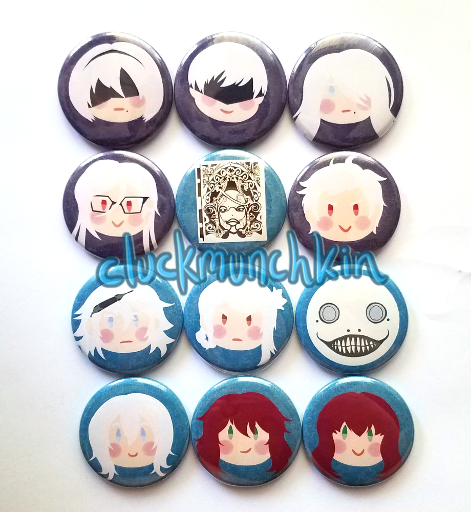 A set of pinback 1.5" buttons featuring your favorite characters from Nier Replicant and Nier Automata! Each design features a cute chibi character head with a distinctive background.